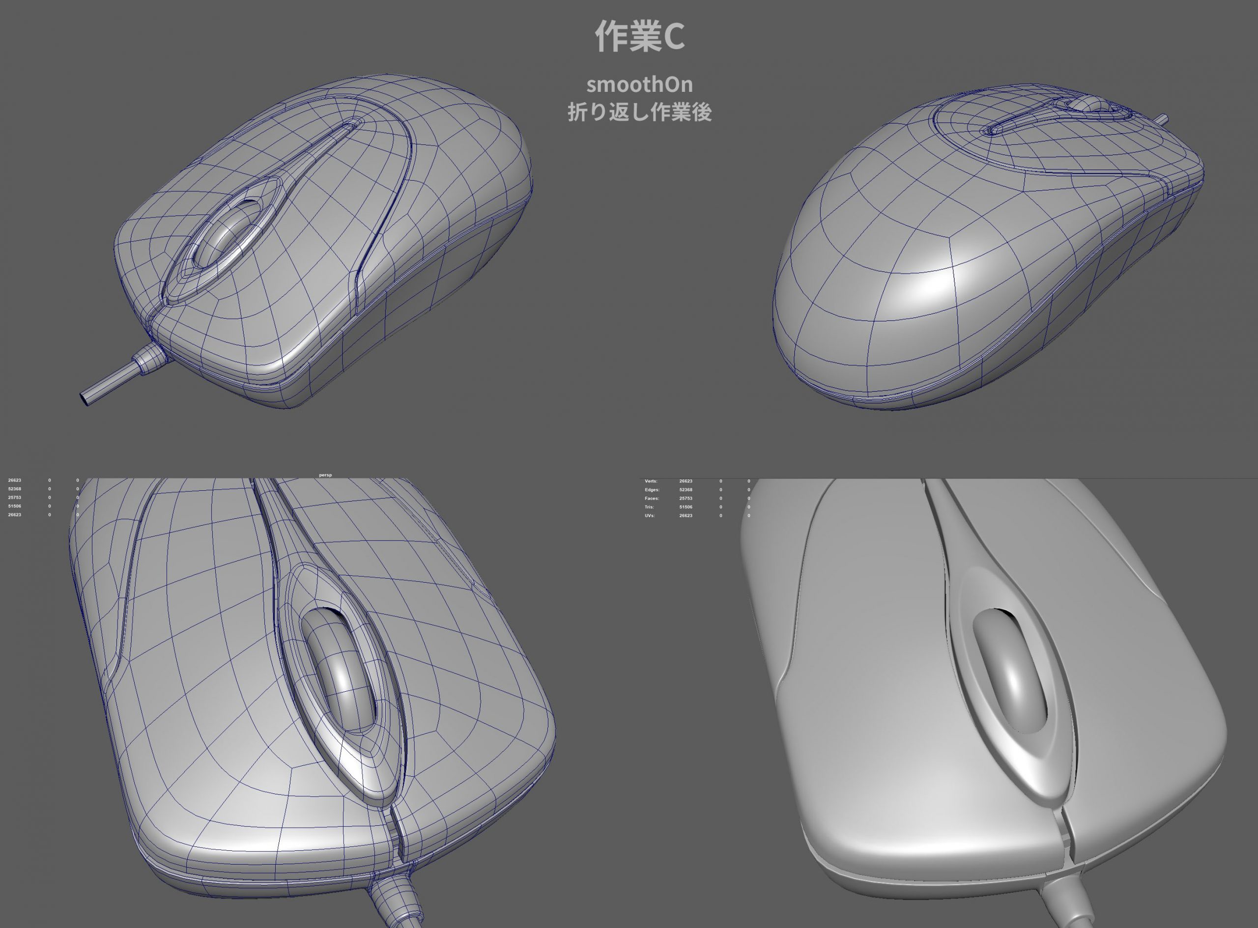 零式防衛術みたいなタイトルになってしまいましたが、弊社でおこなっているハードサーフェスモデリングについて、例を挙げながら手法の解説をしたいと思います。この記事で使っている参考題材は比較的簡単な形状のマウスですが、実際の仕事で扱うモデルはもっと複雑な曲面で構成され、また多数のパーツで作られています。このやり方は厳しいクライアントチェックの中、チーム皆で試行錯誤しながら実際に確立され成果をあげた手法です。